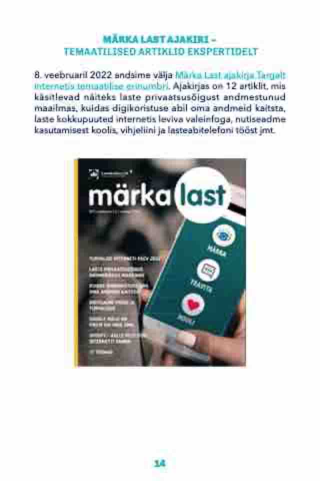 8. veebruaril 2022 andsime välja Märka Last ajakirja Targalt internetis temaatilise erinumbri. Ajakirjas on 12 artiklit, mis käsitlevad näiteks laste privaatsusõigust andmestunud maailmas, kuidas digikoristuse abil oma andmeid kaitsta, laste kokkupuuted internetis leviva valeinfoga, nutiseadme kasutamisest koolis, vihjeliini ja lasteabitelefoni tööst jmt.