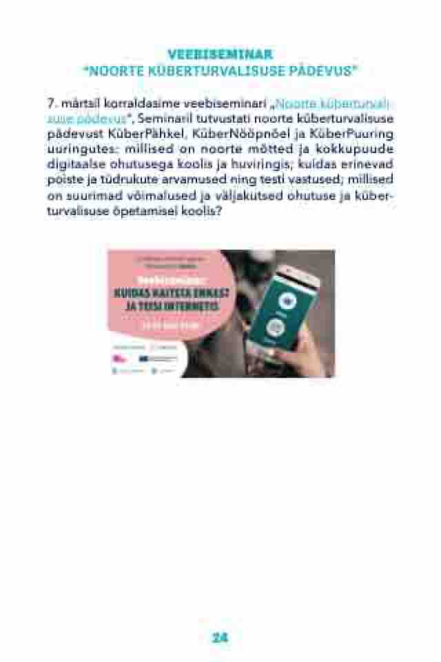 7. märtsil korraldasime veebiseminari „Noorte küberturvali- suse pädevus“, Seminaril tutvustati noorte küberturvalisuse pädevust KüberPähkel, KüberNööpnõel ja KüberPuuring uuringutes: millised on noorte mõtted ja kokkupuude digitaalse ohutusega koolis ja huviringis; kuidas erinevad poiste ja tüdrukute arvamused ning testi vastused; millised on suurimad võimalused ja väljakutsed ohutuse ja küber- turvalisuse õpetamisel koolis?