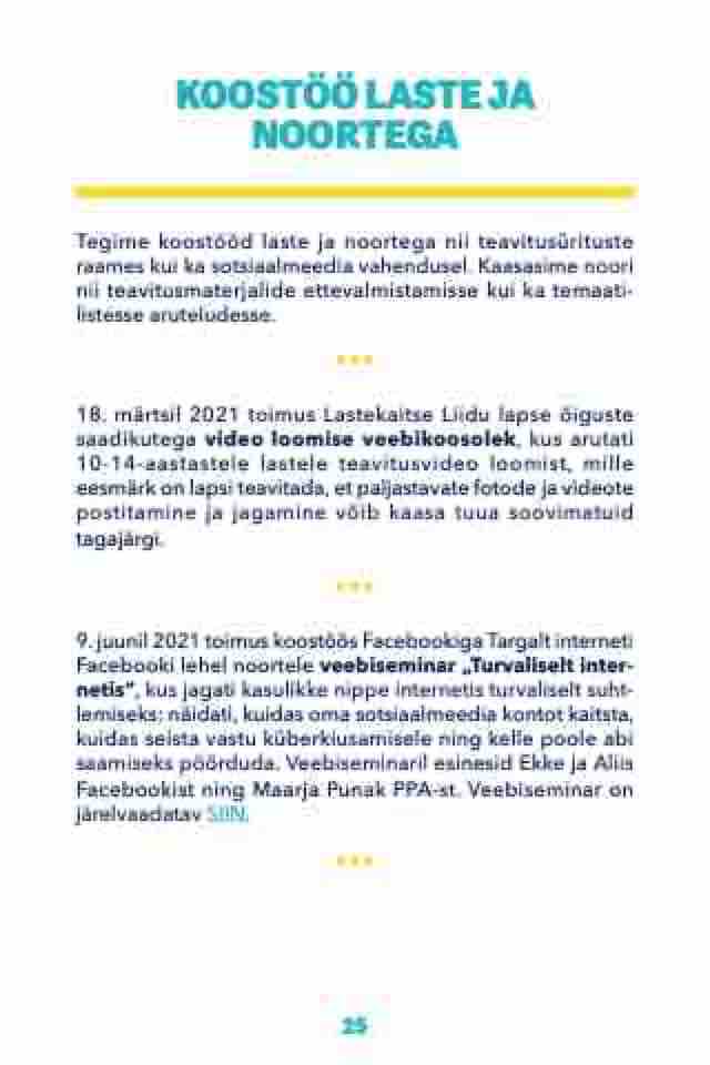 Tegime koostööd laste ja noortega nii teavitusürituste raames kui ka sotsiaalmeedia vahendusel. Kaasasime noori nii teavitusmaterjalide ettevalmistamisse kui ka temaati- listesse aruteludesse.