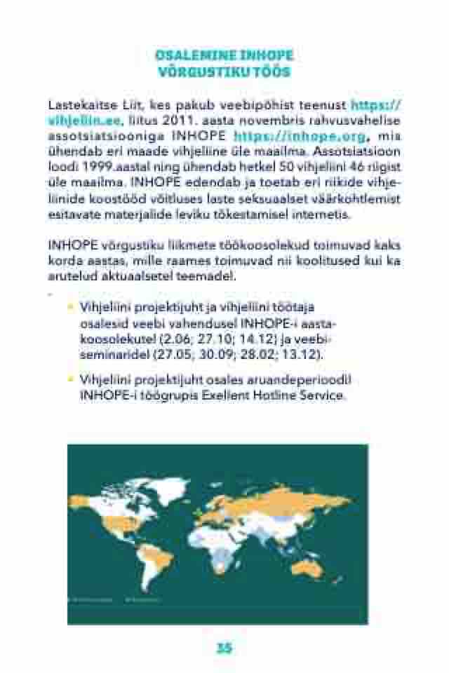 Lastekaitse Liit, kes pakub veebipõhist teenust https:// vihjeliin.ee, liitus 2011. aasta novembris rahvusvahelise assotsiatsiooniga INHOPE https://inhope.org, mis ühendab eri maade vihjeliine üle maailma. Assotsiatsioon loodi 1999.aastal ning ühendab hetkel 50 vihjeliini 46 riigist üle maailma. INHOPE edendab ja toetab eri riikide vihje- liinide koostööd võitluses laste seksuaalset väärkohtlemist esitavate materjalide leviku tõkestamisel internetis.