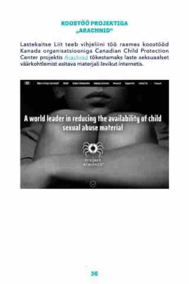 KOOSTÖÖ PROJEKTIGA „ARACHNID“ Lastekaitse Liit teeb vihjeliini töö raames koostööd Kanada organisatsiooniga Canadian Child Protection Center projektis Arachnid tõkestamaks laste seksuaalset väärkohtlemist esitava materjali levikut internetis. 36