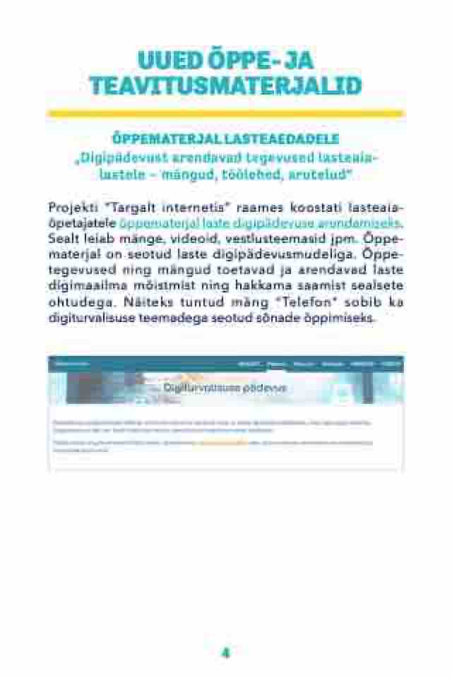 Projekti “Targalt internetis” raames koostati lasteaia- õpetajatele õppematerjal laste digipädevuse arendamiseks. Sealt leiab mänge, videoid, vestlusteemasid jpm. Õppe- materjal on seotud laste digipädevusmudeliga. Õppe- tegevused ning mängud toetavad ja arendavad laste digimaailma mõistmist ning hakkama saamist sealsete ohtudega. Näiteks tuntud mäng “Telefon” sobib ka digiturvalisuse teemadega seotud sõnade õppimiseks.