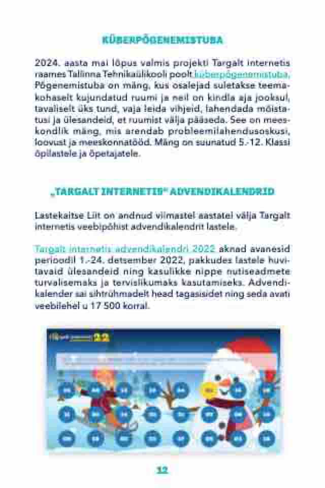 Targalt internetis advendikalendri 2022 aknad avanesid perioodil 1.-24. detsember 2022, pakkudes lastele huvi- tavaid ülesandeid ning kasulikke nippe nutiseadmete turvalisemaks ja tervislikumaks kasutamiseks. Advendi- kalender sai sihtrühmadelt head tagasisidet ning seda avati veebilehel u 17 500 korral.