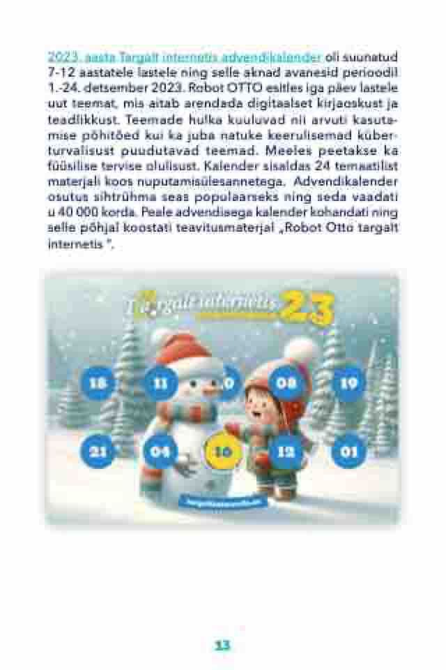 2023. aasta Targalt internetis advendikalender oli suunatud 7-12 aastatele lastele ning selle aknad avanesid perioodil 1.-24. detsember 2023. Robot OTTO esitles iga päev lastele uut teemat, mis aitab arendada digitaalset kirjaoskust ja teadlikkust. Teemade hulka kuuluvad nii arvuti kasuta- mise põhitõed kui ka juba natuke keerulisemad küber- turvalisust puudutavad teemad. Meeles peetakse ka füüsilise tervise olulisust. Kalender sisaldas 24 temaatilist materjali koos nuputamisülesannetega. Advendikalender osutus sihtrühma seas populaarseks ning seda vaadati u 40 000 korda. Peale advendiaega kalender kohandati ning selle põhjal koostati teavitusmaterjal „Robot Otto targalt internetis “.