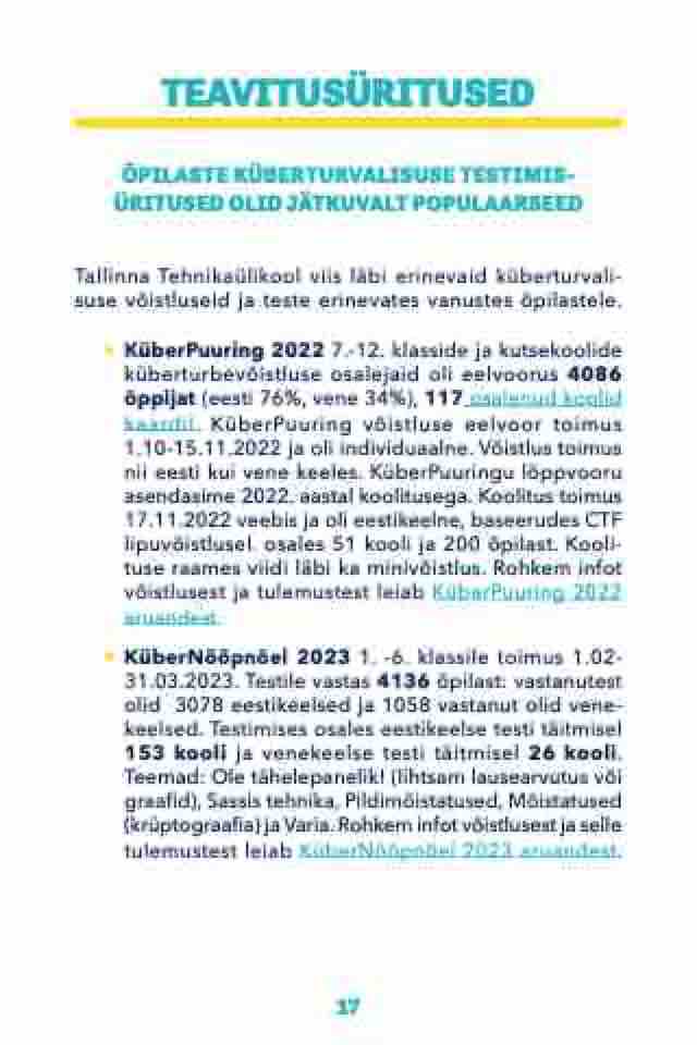 Tallinna Tehnikaülikool viis läbi erinevaid küberturvali- suse võistluseid ja teste erinevates vanustes õpilastele.