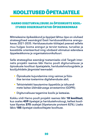 Selle strateegilise eesmärgi toetamiseks viidi Targalt inter- netis projekti raames läbi Harno poolt digiturvalisuse ja õpioskuste koolitusi õpetajatele, haridustehnoloogidele ja koolijuhtidele järgmistel teemadel: