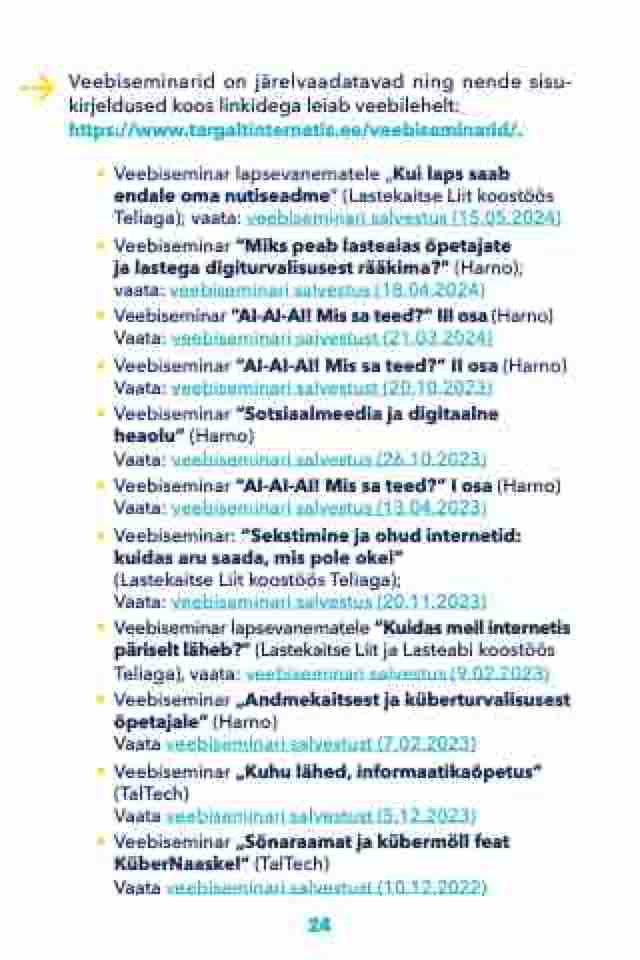 • Veebiseminar “Miks peab lasteaias õpetajate ja lastega digiturvalisusest rääkima?” (Harno); vaata: veebiseminari salvestus (18.04.2024)