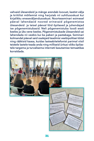 vahvaid ülesandeid ja mänge arendab loovust, kastist välja ja kriitilist mõtlemist ning harjutab nii suhtlusoskust kui kirjalikku eneseväljendusoskust. Noorteseminari esimesel päeval lahendasid noored erinevaid põgenemistoa ülesandeid ja teisel päeval lõid õpilased ja juhendajad ise põgenemistubasid. Neli põgenemistuba loodi eesti keeles ja üks vene keeles. Põgenemistubade ülesandeid sai lahendada nii veebis kui ka paberi ja pastakaga. Seminari kolmandal päeval said osalejaid teadmisi veebipolitsei tööst ning rääkisid kaasa, kuidas lasteabitelefonist parimal viisil teistele lastele teada anda ning milliseid üritusi võiks õpilas- tele targema ja turvalisema interneti kasutamise temaatikas korraldada.
