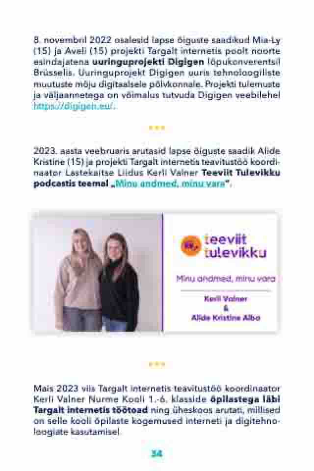 2023. aasta veebruaris arutasid lapse õiguste saadik Alide Kristine (15) ja projekti Targalt internetis teavitustöö koordi- naator Lastekaitse Liidus Kerli Valner Teeviit Tulevikku podcastis teemal „Minu andmed, minu vara“.