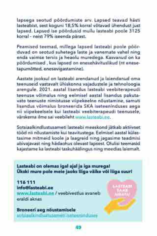 Sotsiaalkindlustusameti lasteabi meeskond jätkab aktiivset tööd nii nõustamiste kui teavitustega. Eelmisel aastal külas- tasime mitmeid koole ja laagreid ning jagasime teadmisi abivajavast ning hädaohus olevast lapsest. Olulisi teemasid kajastame ka lasteabi taskuhäälingus ning meedias laiemalt.
