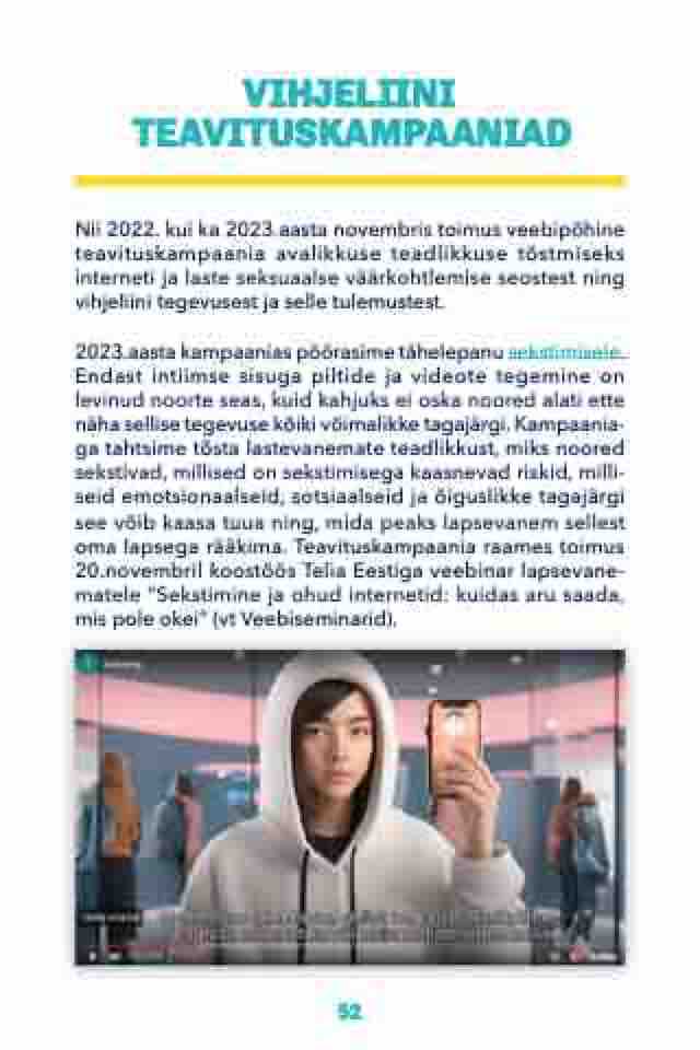 2023.aasta kampaanias pöörasime tähelepanu sekstimisele. Endast intiimse sisuga piltide ja videote tegemine on levinud noorte seas, kuid kahjuks ei oska noored alati ette näha sellise tegevuse kõiki võimalikke tagajärgi. Kampaania- ga tahtsime tõsta lastevanemate teadlikkust, miks noored sekstivad, millised on sekstimisega kaasnevad riskid, milli- seid emotsionaalseid, sotsiaalseid ja õiguslikke tagajärgi see võib kaasa tuua ning, mida peaks lapsevanem sellest oma lapsega rääkima. Teavituskampaania raames toimus 20.novembril koostöös Telia Eestiga veebinar lapsevane- matele “Sekstimine ja ohud internetid: kuidas aru saada, mis pole okei” (vt Veebiseminarid).