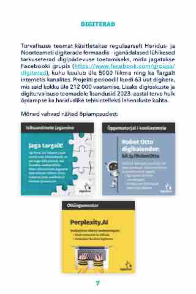 Turvalisuse teemat käsitletakse regulaarselt Haridus- ja Noorteameti digiterade formaadis – iganädalased lühikesed tarkuseterad digipädevuse toetamiseks, mida jagatakse Facebooki grupis (https://www.facebook.com/groups/ digiterad), kuhu kuulub üle 5000 liikme ning ka Targalt internetis kanalites. Projekti perioodil loodi 63 uut digitera, mis said kokku üle 212 000 vaatamise. Lisaks digioskuste ja digiturvalisuse teemadele lisandusid 2023. aastal terve hulk õpiampse ka hariduslike tehisintellekti lahenduste kohta.