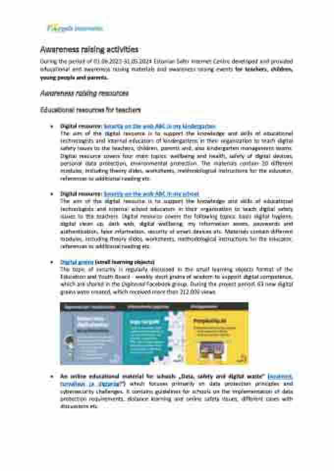 During the period of 01.06.2022-31.05.2024 Estonian Safer Internet Centre developed and provided educational and awareness raising materials and awareness raising events for teachers, children, young people and parents.