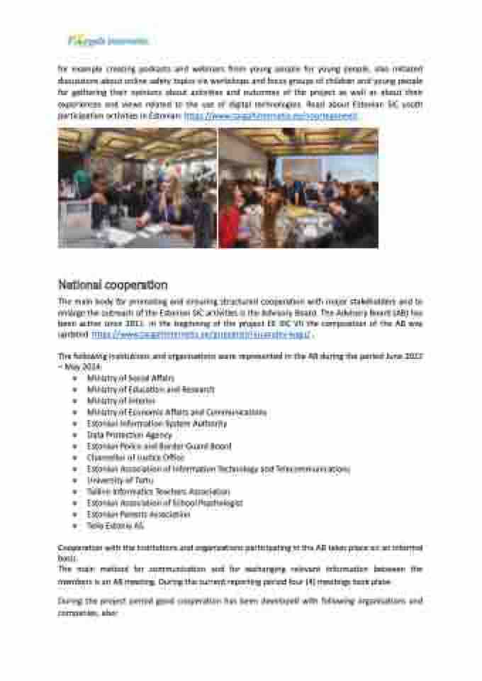 The main body for promoting and ensuring structured cooperation with major stakeholders and to enlarge the outreach of the Estonian SIC activities is the Advisory Board. The Advisory Board (AB) has been active since 2011. In the beginning of the project EE SIC VII the composition of the AB was updated https://www.targaltinternetis.ee/projektist/nouandev-kogu/ .