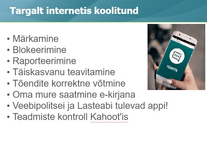 Loodame, et leiate siit palju kasulikku materjali ning meie ühise töö kaudu suurenevad õpilaste teadmised interneti ja digitaalsete kommunikatsioonivahendite turvalisest, tervislikust ja vastutustundlikust kasutusest.