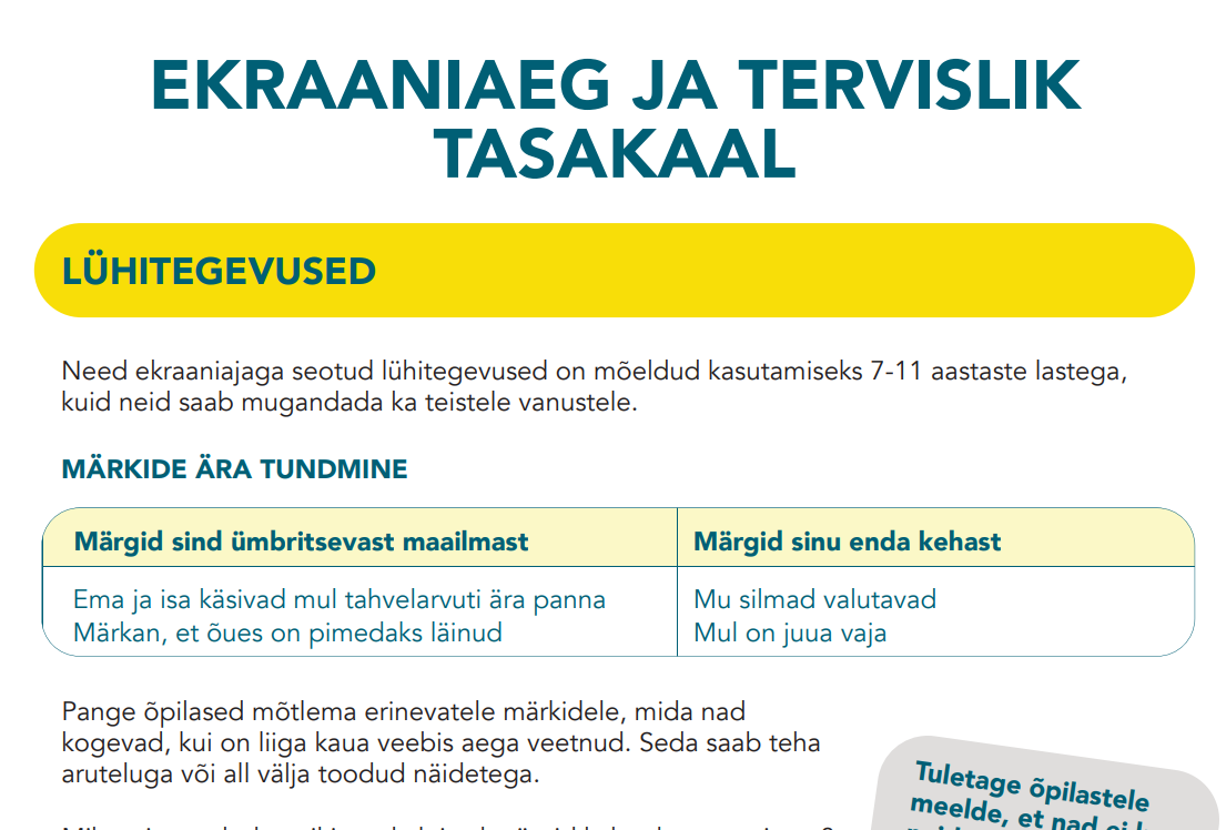 Targalt internetis tunnikava “Ekraaniaeg ja tervislik tasakaal” (1.-5. klass)