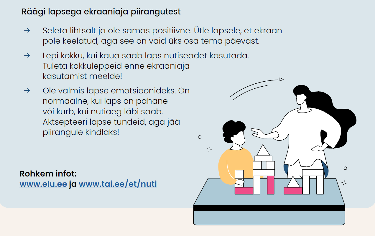 • Kui nutiaeg saab läbi, pane seade ära – nii on lapsel lihtsam keskenduda muule tegevusele.